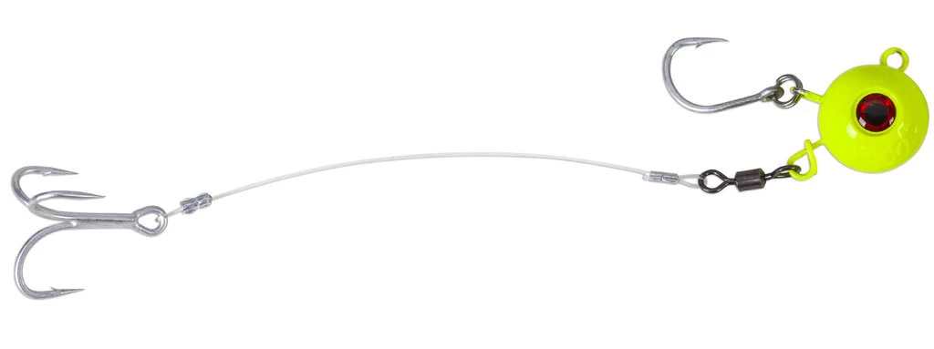 Schweres Fireball System fĂŒr die Meeresangelei. Geliefert wird das System mit Bleikopf sowie einem mittels Sprengring montiertem Haken und einem Fluorocarbon-Stinger mit Drilling in GröĂe 4/0. ZusĂ€tzlich ist ein spezieller Austauschhaken im Lieferumfang enthalten, der bei der Verwendung von z. B. Gummiködern zum Einsatz kommt. Alle Haken sind mit einer rostfreien Beschichtung versehen. Der Stinger kann einfach durch das am Bleikopf angebrachte Quick Change System montiert werden. Zudem ist der Bleikopf mit einem fluoreszierenden Lack versehen. Das System gibt es in den Gewichten von 200g bis 500g.