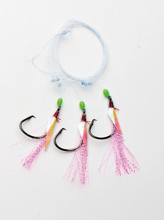 Dieses Dorschfliegen-Vorfach besitzt 3 Haken der Größe 3/0, welche an einer 0,60mm starken monofilen Schnur befestigt sind. Die Vorfachlänge beträgt 1,50m.