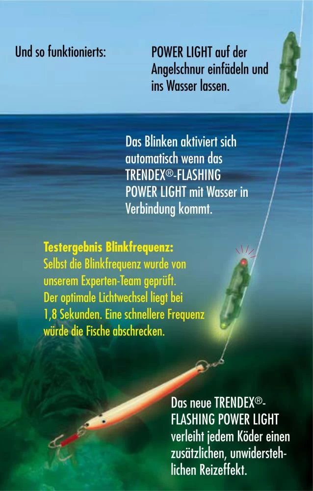 Die Flashing Power Lights sorgen für deutlich mehr Fangerfolg. Das neue TRENDEX®-FLASHING POWER LIGHT verleiht jedem Köder einen zusätzlichen, unwiderstehlichen Reizeffekt. Das Behr-Experten Team war mit diesem Top-Produkt in unterschiedlichen Gewässern zum Testen unterwegs. Überall waren die Fangergebnisse überdurchschnittlich höher als ohne „Flashing Power Light“.