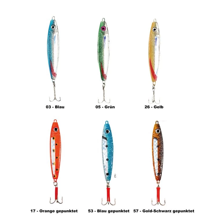 Dieser Pilker ist bleifrei. Er ist in sechs Farben und 6 verschiedenen Gewichten verfĂŒgbar. Er ist in den Farben Blau-Silber, GrĂŒn-Silber, Gelb-Silber, Orange gepunktet, Blau gepunktet und Gold-Schwarz gepunktet lieferbar. Die Gewichte gehen von 30g – 200g.