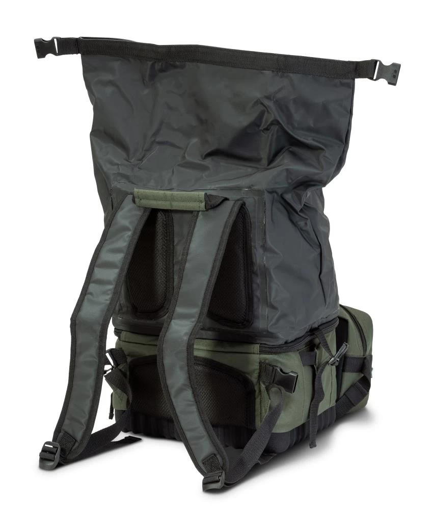 Kurz gesagt, ein Rucksack mit „Trockenabteil“. Der obere Teil des Iron Claw Dry Packer ist aus Heavy Duty PVC gefertigt und mittels Rollsystem wasserdicht verschlieĂbar. Im separaten, unteren Fach des Rucksacks befinden sich vier Boxen. zudem ist die frontseitig aufgebrachte Tasche mittels Clips abnehmbar und lĂ€sst sich durch den angebrachten Gurt auch separat als Bauchtasche einsetzen.Â