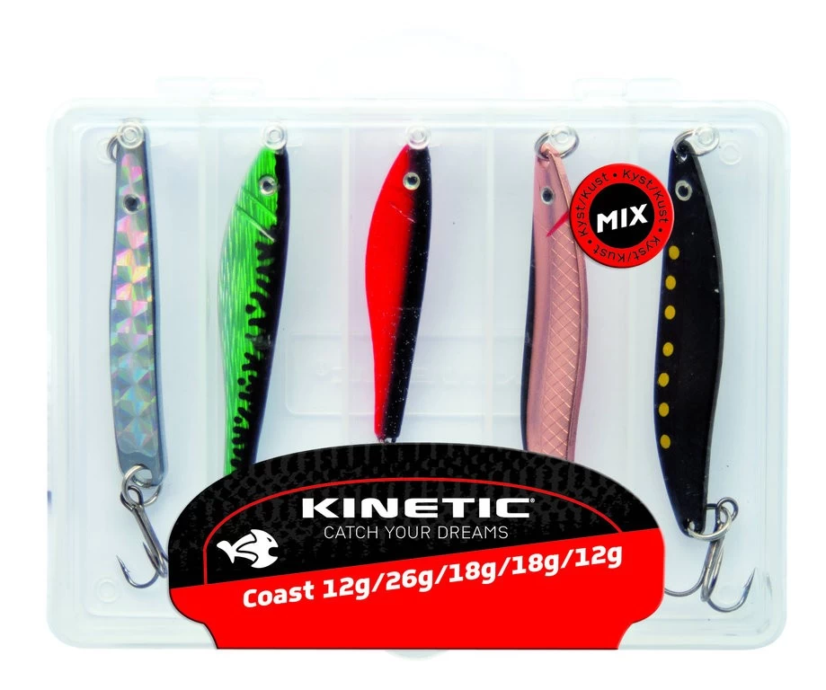 Dieses Set besteht aus einer stabilen und praktischen Köderbox, welche 5 verschiedenfarbige Meerforellenblinker und Pilker der Typen Sildeglimt, Horni und Jebo Herring enthält.