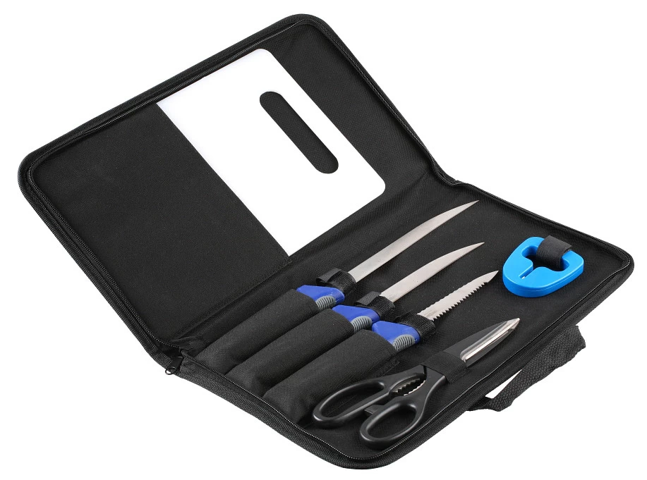 Dieses Set beinhaltet Messer aus qualitativ hochwertigen, japanischen 440 Edelstahl. Es ind 2 Filetiermesser mit 6 und 8 inch enthalten. Sie besitzen eine speziell profilierte, weiche und super scharfe Klinge, die perfekt fĂŒr das Trennen des Fleisches von der GrĂ€te sind. Weiter gibt es ein 5 inch Ausbeinmesser mit Wellenschliff sowie einem MesserschĂ€rfer. Alle Messer im Set besitzen einen rutschfesten Griff und sind in einem praktischen Etui verpackt. ZusĂ€tzlich ist in diesem Etui ein Schneidebrett enthalten.