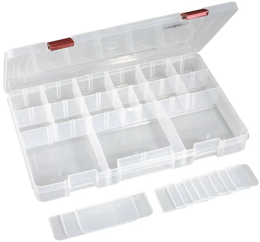 Diese Zubehörbox hat eine Größe von 35 x 22 x 5cm. Sie ist individuell einteilbar und damit optimal für die Aufbewahrung von Blinkern, Spinnern oder sonstigen Zubehör geeignet. Sie ist einer sehr gute Ergänzung des MIKADO Taschenprogramms.