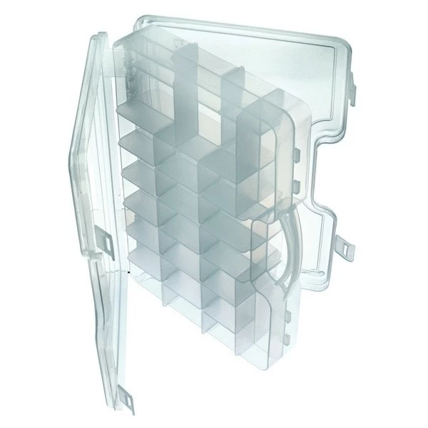 Diese praktische Angelzubehörbox ist zweiseitig befüllbar und hat eine Größe von 300x210x70mm. Die Größe der einzelnen Abteile ist fest und kann nicht variiert werden. Eine sehr praktische Köder- und Zubehörbox mit viel Platz.