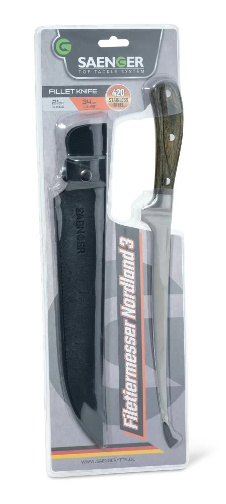 Dieses Filetiermesser hat eine 21cm lange Klinge, um auch große Fische zu filetieren. Die Gesamtlänge beträgt 34cm. Gefertigt ist die Klinge aus 420 Edelstahl. Zur Aufbewahrung wird eine Messerscheide mitgeliefert.