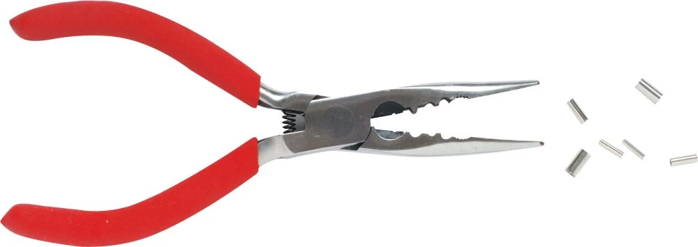Praktisch zum Selber-Crimpen von Stahlvorfächern. Lieferung mit einer Erstausstattung an Hülsen in 5 Durchmessern, 100 Stück. Lieferung in Kunststoff-Box.